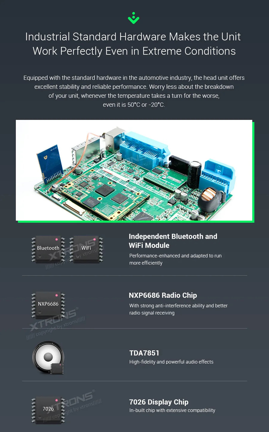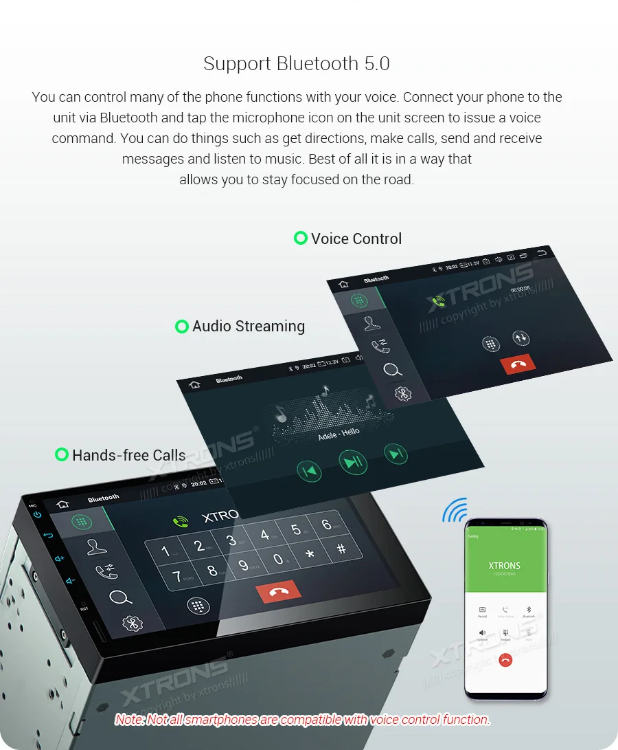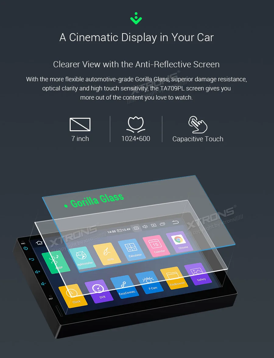 *Android 9.0 Operating System, RockChip PX30 Resolution *16GB ROM, 2GB DDR3 RAM, Quad-Core ARM Cortex A35 64Bit Processor /1.5GHz *7 inch HD TFT capacitive touch screen, 1024*600 pixel screen resolution *Support playing 1080P high definition video *Full RCA output function /NO DVD function *Optional DAB function *Optional OBD function *Optional TPMS function *Steering wheel control *Dual Zone function *Screen Mirroring Function *Support 3G/4G/Wi-Fi connection *Support online/offline navigation *XTRONS UI, Colorized button light, Random mode included. *Built-in Bluetooth, support Bluetooth 5.0 for handsfree calls and music *Built-in SD/USB Port *Built-in RDS *Support front/reversing camera input and DVR input *Built-in amplifier (48 watts x 4 channel) power output *Optional Accessories to perfect your user Experience